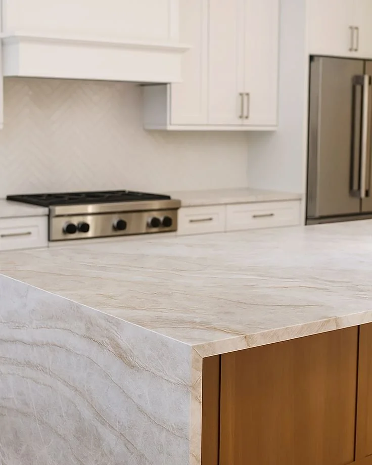 KITCHEN ISLANDS: Taj Mahal's warm tones and dramatic veining make it the signature choice for statement kitchen islands. A polished Taj Mahal island catches light beautifully, creating a focal point in open-concept kitchens.