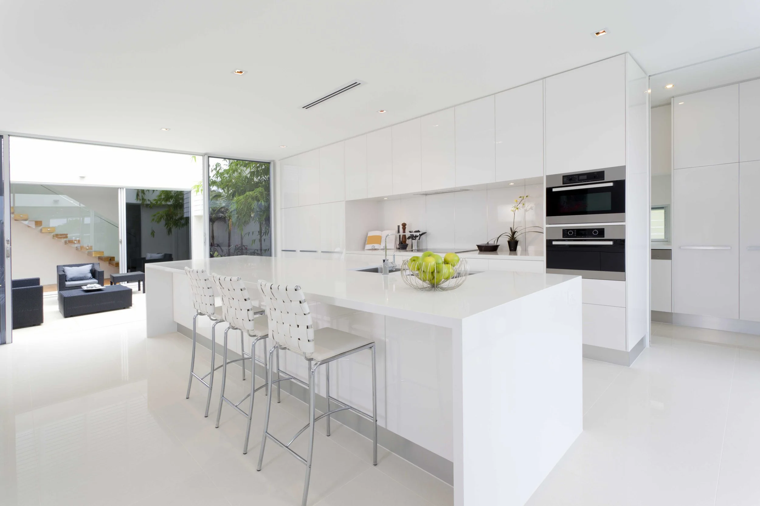 MODERN KITCHENS: White quartz countertops + stainless steel appliances + white lacquer cabinetry = minimalist luxury. The consistency of engineered quartz ensures sleek continuity across large kitchen islands.