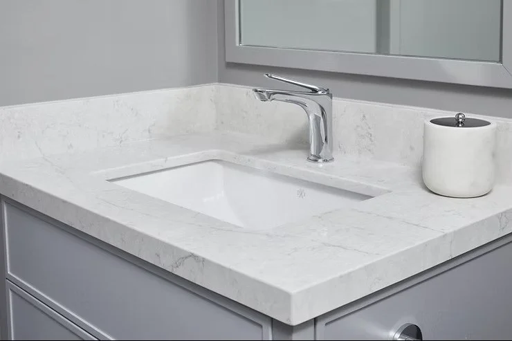BATHROOM VANITIES: White quartz on a spa-like bathroom vanity creates instant luxury. Pair with a white or light gray tile backsplash and polished chrome fixtures for a spa-resort aesthetic. Works equally well in powder rooms and master ensuite baths.